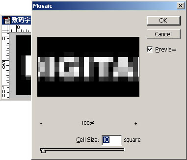 选中文字的图层,按ctrl + E将该图层与背景层合并。然后选择 layer / duplicate layer复制该图层。选中被复制的图层(保证被复制的图层在原图层的上方),选择filter / Pixelate / Mosaic,在弹出的面板上选择cell size 为10,如图3所示。