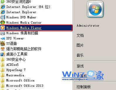 1、点击开始按钮,在开始菜单中找到“Windows Media Player”后单击选择打开它;