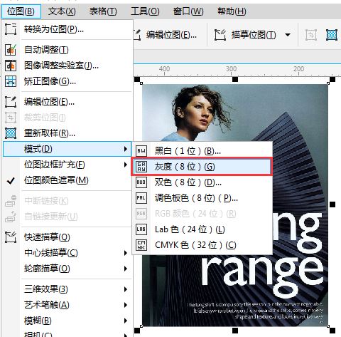 2、接着执行“位图”>“模式”>“灰度”,将图片转换为灰度模式。