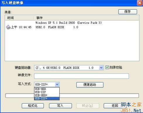 5, 插入U盘后,在UltraISO中选择“启动→写入硬盘映像”,在“硬盘驱动器”中应该能看到你的U盘(如图3)。UltraISO提供了四种写入方法, 其中“USB-ZIP+”比“USB-ZIP”的兼容性还好,且绝大多数提供USB启动的主板都提供“USB-ZIP”模式,因此在“写入方式”中要优先 选择“USB-ZIP+”。