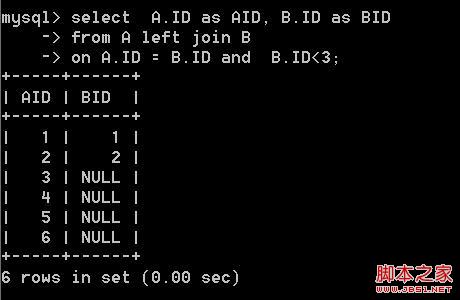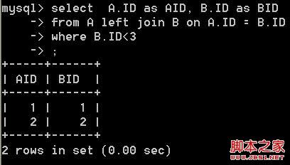 select A.ID as AID, B.ID as BID from A left join B on A.ID = B.ID where B.ID<3
