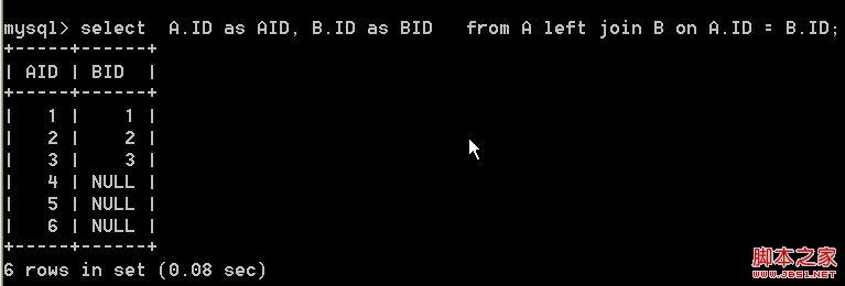 但是我们也发现 AID 与 中AID 1 于2对应的值为NULL,关联表只取了满足A表筛刷选条件的值。