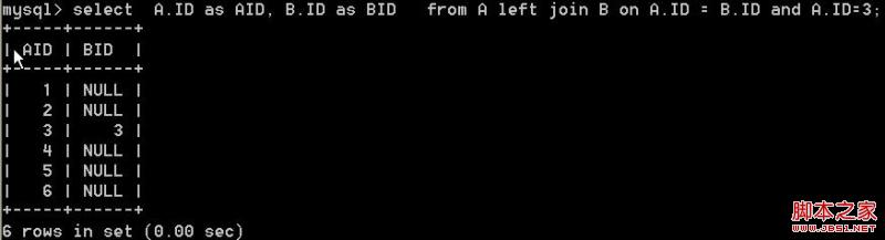 select A.ID as AID, B.ID as BID from A left join B on A.ID = B.ID and A.ID = 3