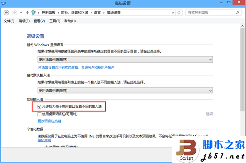 这时在对话框的左侧我们能看到“高级设置”,进入后我们就能在“切换输入法”下看到“允许我为每个应用窗口设置不同的输入法”的选项,现在你只要在这一条前打上勾就可以了。