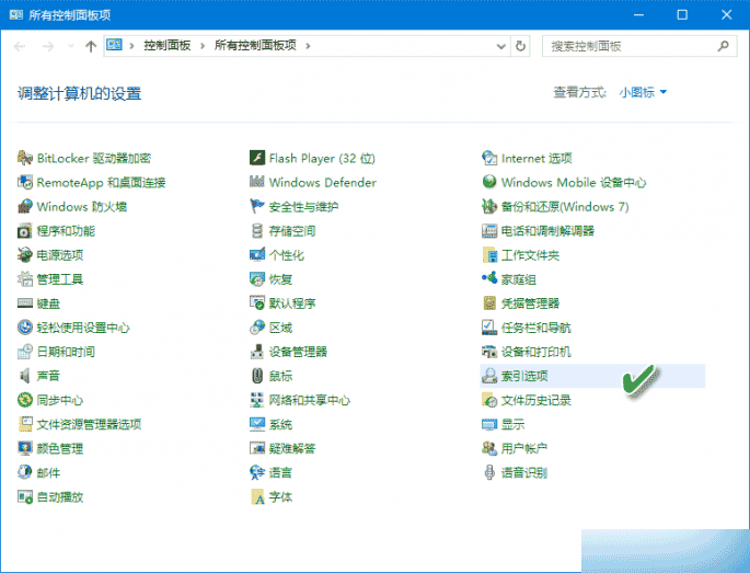 在控制面板中以“小图标”方式显示并找到“索引选项”并点击进入