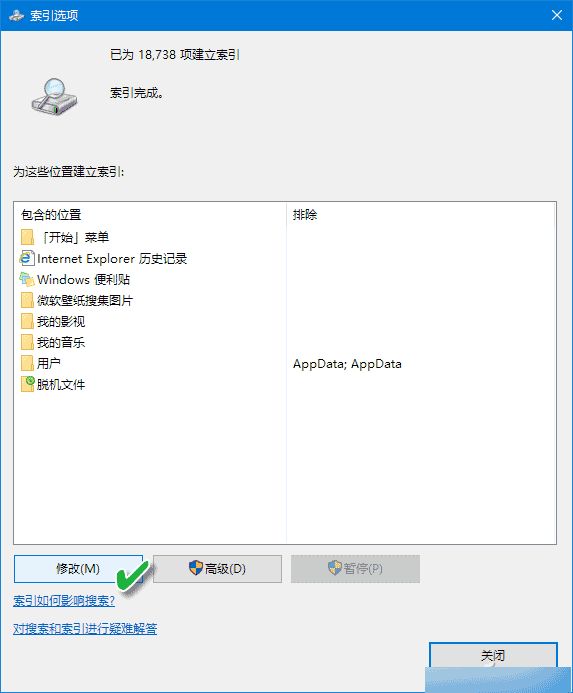 添加索引“C:\ProgramData\Microsoft\Windows\Start Menu”(如果已经有了就可以跳过)
