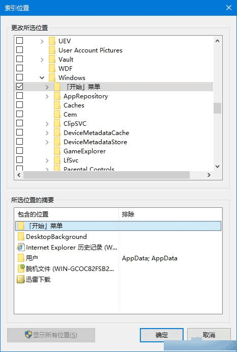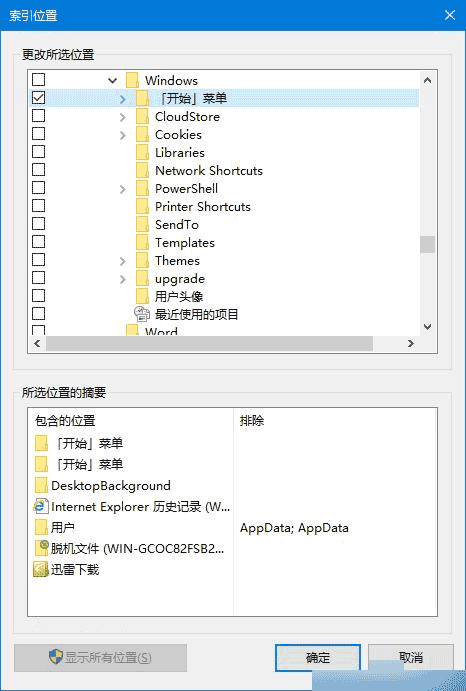 继续添加索引“C:\Users\用户名\AppData\Roaming\Microsoft\Windows\Start Menu\”
