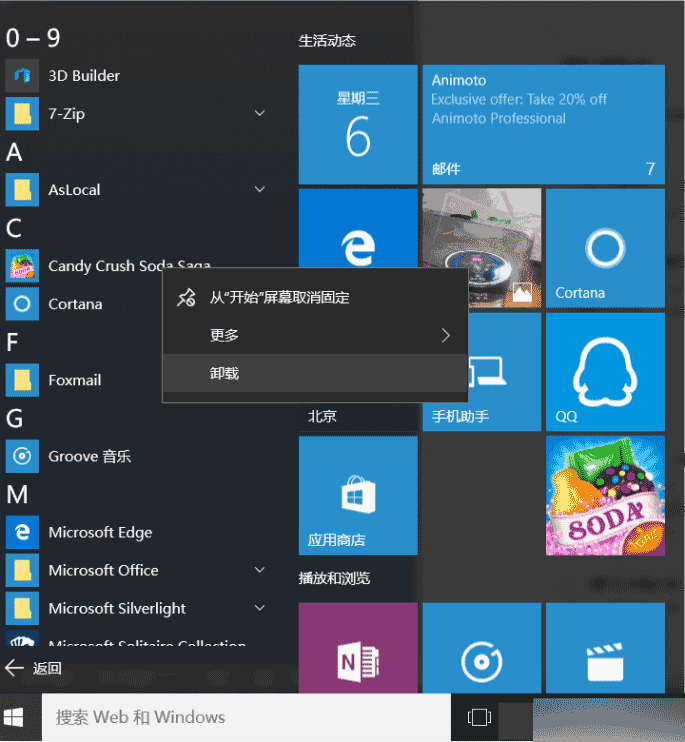 冗余应用一键卸载,在开始菜单选中应用,再右击选择“卸载”
