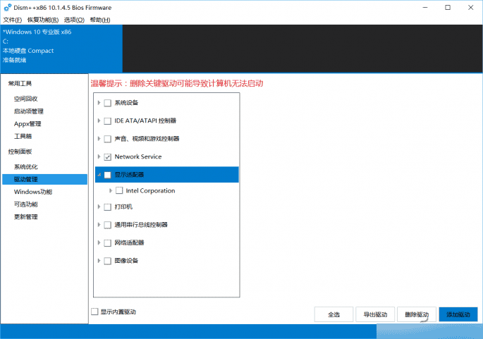 除了上述组件外,Windows 10内还有其他需要精简的组件如冗余注册表键值、过期驱动、WinSXS临时文件等,对于这些内容的清理可以借助专业工具如Dism++完成。启动Dism++后切换到相应的功能组件进行精简即可,如切换到“驱动管理”,在你需要删除的驱动上打勾,再点击移除驱动即可。