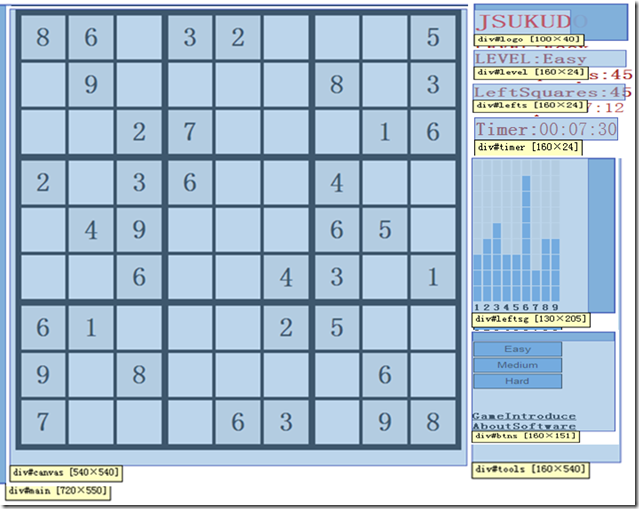 body的代码如下,页面主体使用main层来控制尺寸,main中包含两个层:canvas和tools,分别用来承载数独表格和辅助信息。tools层中嵌套了logo,level,lefts,timer,leftsg,btns,err共七个层,分别用来承载LOGO、游戏难度、剩余空格数、已用时间、剩余空格数明细、按钮和错误提示信息。tools层中的样式写在default.css样式文件中。canvas层、level层、lefts层、timer层、leftsg层、err层的内容由jquery控制动态生成,后续会有解释。