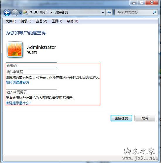 首先点击“开始-控制面板-用户账户”,然后对用户账户创建密码,输入完成后即可创建好密码了。设置完成后我们也可以对其进行删除密码和更改密码操作。如图所示: