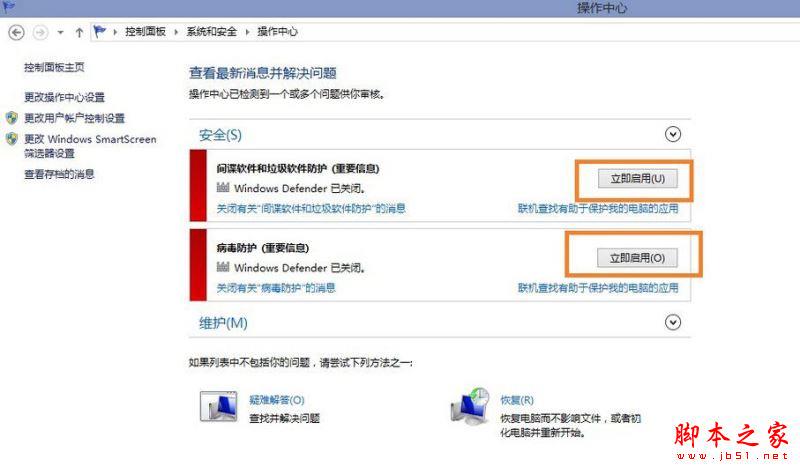 2、然后在打开的操作中心窗口中,点击“安全(S)”下面的两个“立即启用”按钮启用windows Defender杀毒软件,如下图所示: