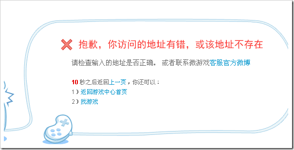 如果我们访问一下不存在的游戏应用,例如game.weibo.com/ilovecoffee222,则会输出如下的错误提示: