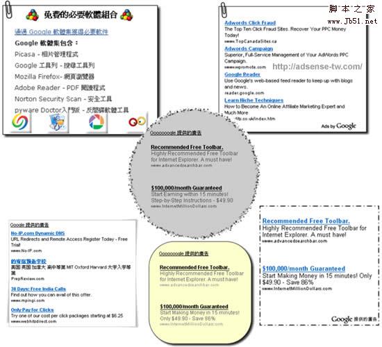 但什么样的广告背景是被禁止的呢? 很明显的有箭头指示的图片装饰或鼓励点击的语文是肯定被禁止的。那AdSense计划政策中规定不得使牢图形花招,但什么样才算图形花招呢? 目前没有看见官方有更进一步的说明和解释。