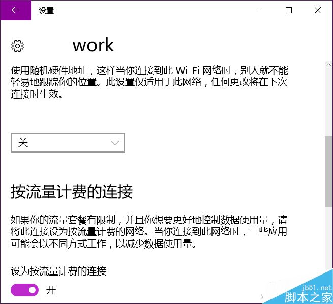 在弹出设置中,下拉菜单找到“按流量计费的连接”,点击打开“设为按流量计费的链接”即可。