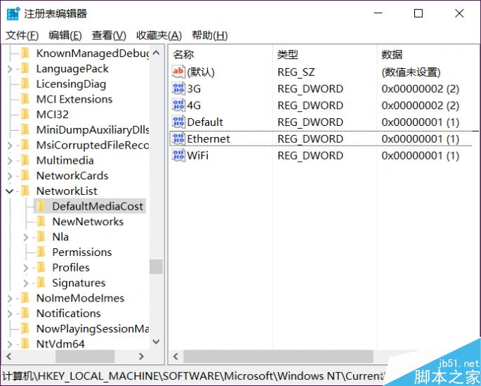 是不是灰常简单?问题是每一个链接的无线都要设置,然后最重要的,如果是用有线都没有这个选项。好,重点来了——打开注册表(单击开始菜单输入Regedit回车),定位到HKEY_LOCAL_MACHINE\SOFTWARE\Microsoft\Windows NT\CurrentVersion\NetworkList\DefaultMediaCost,如图: