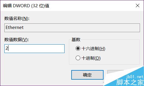 这里就是修改默认连接方式的地方了,选中DefaultMediaCost,在右侧找到Ethernet(即有线网络连接),双击编辑DWORD值,将数值数据修改为“2”确定即可。