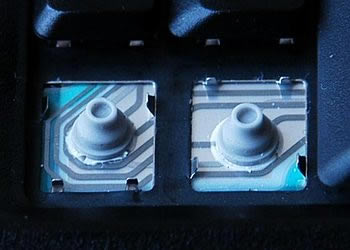 下图就是连支架一起整个扳出来的键盘,可以看到上面的电路和导电橡胶(导电白色介质为激光所做,如果断裂和磨损,一般选择更换键盘,也可用铅笔描画或用薄的锡泊纸代替后用胶带沾牢,但效果不好)。平时如果有觉得键盘按键不灵光的时候,就有可能是导电橡胶老化或者下面有灰尘之类的东西影响了它的性能,这时就可以把导电橡胶轻轻往上取出来,用无水酒精抹一下下面进行清理;或者有其它杂物也可以进行清理。大家留意看一下,两个按钮有底座有什么不同?就是突出部分的方向不同,这关系到后面如何装回去。