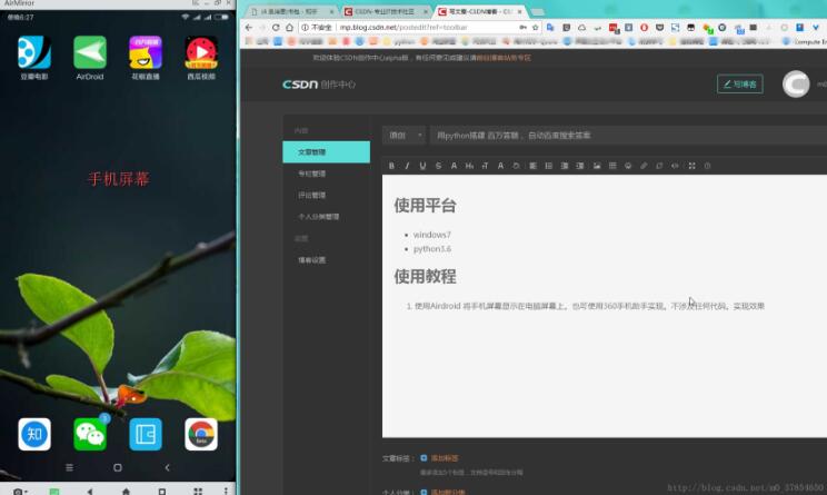 1、使用Airdroid 将手机屏幕显示在电脑屏幕上。也可使用360手机助手实现。不涉及任何代码。实现效果如图: