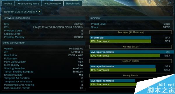 所测游戏时大家耳熟能详的《奇点灰烬(AOTS)》,这是首款DX12游戏,虽然在玩家市场声音不大,但因为DX12 API的缘故,跑分是个不错的选择(尤其A卡)。