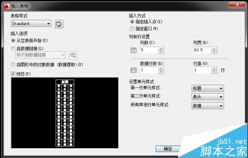 1、先打开CAD,找到菜单栏中的“绘图”菜单项,点击其中的“表格”选项,出现如下图对话框: