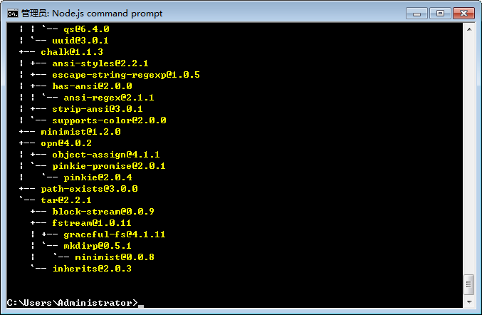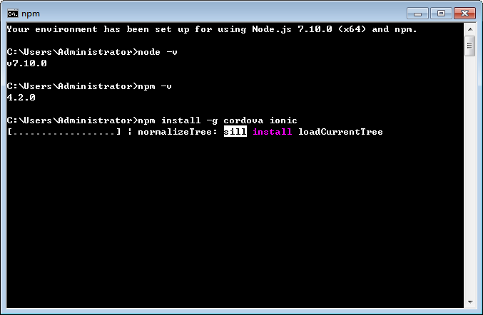 3.通过npm安装cordova和ionic。输入:npm install -g cordova ionic