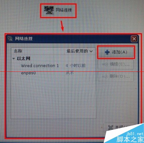 2、点击网络连接,若此时无线信号的名字已经被识别到,直接在左侧框中选择后加入连接即可。若无线信号没有被识别到(比如隐藏的SSID),点击添加;
