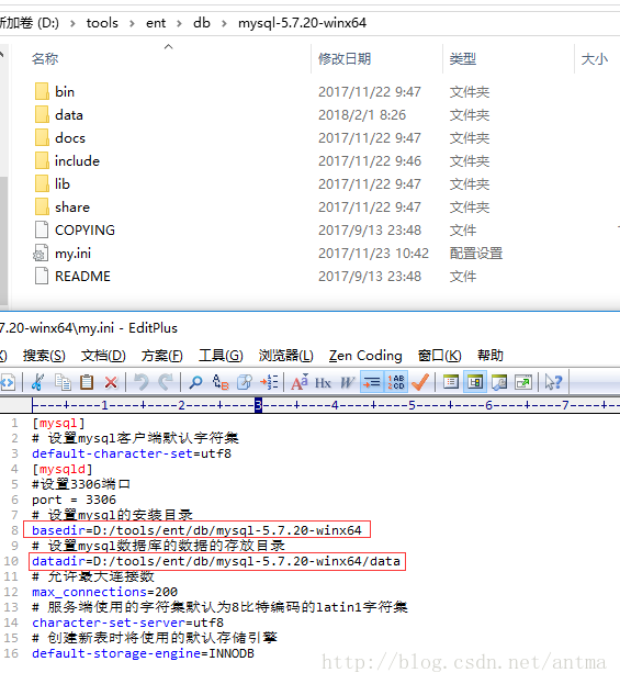 3、在mysql要目录下创建 my.ini 文件,如上图,文件内容如下,basedir 和 datadir 修改为相应地址: