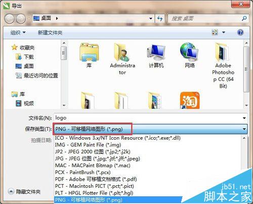 2、单击“文件→导出”命令,在导出对话框中的文件类型中选择“PNG”(或者PSD,TIFF),这些都是图片透明格式。