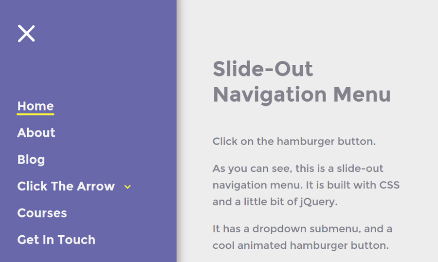 <div class="menu-wrap"> <div class="menu-sidebar"> <ul class="menu"> <li><a href="#">Home</a></li> <li><a href="#">About</a></li> <li><a href="#">Blog</a></li> <li class="menu-item-has-children"><a href="#">Click The Arrow</a> <span class="sidebar-menu-arrow"></span> <ul class="sub-menu"> <li><a href="#">Alignment</a></li> <li><a href="#">Markup</a></li> <li><a href="#">Comments</a></li> </ul> </li> <li><a href="#">Courses</a></li> <li><a href="#">Get In Touch</a></li> </ul> </div> </div>