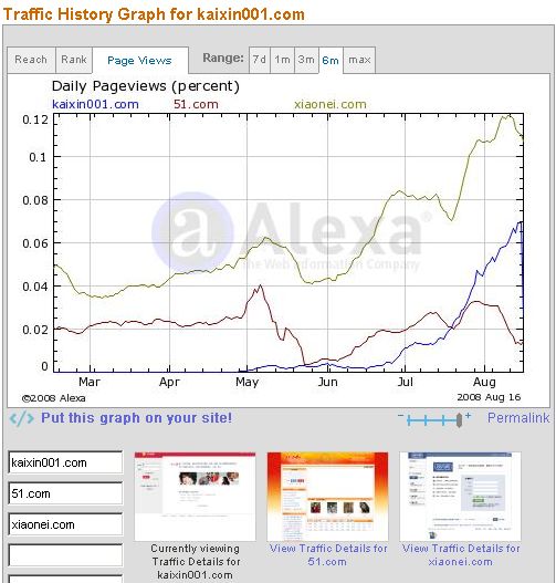 开心网从五月份开始发力,依靠MSN等病毒营销,依靠创新的产品,在竞争对手,来不及反应的时候迅速抢占先机。下图alexa的Page views数据趋势图(2008.8.20),从该图可以看出,从5月份到6月中旬,流量比较平稳,是酝酿期和积累期,从6月底开始开心网进入了爆发的阶段,并靠短短的两个月之内,流量大幅度攀升。甚至在一段时间内超越了51。