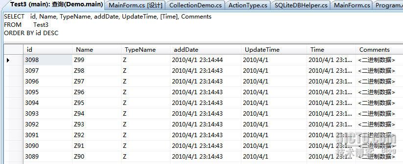 需要说明的是在System.Data.SQLite中数据类型的规定不适很严格,从创建Test3表的SQL语句来看,表中addDate、UpdateTime、Time分别是DateTime、Date、Time类型字段,但实际上我们插入的时候没有按照这个规定,最终显示的结果也是尽量遵循数据库字段的定义。