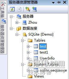 这时候选择System.Data.SQLite使用的数据库文件,文件后缀默认是.db3,还可以点击下方的“测试连接”按钮,如果没有问题就会弹出正确的对话框,点击“确定”按钮之后在服务器资源管理器中就会出现如下的情况: