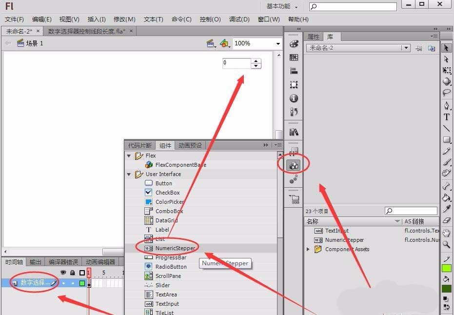 1、新建一个数字选择器图层,将NumericStepper元件拖动到舞台合适位置。