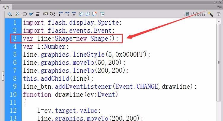 3、新建代码图层,打开动作面板。首先,创建一个Shape类实例,用变量line引用它,用来绘制直线。
