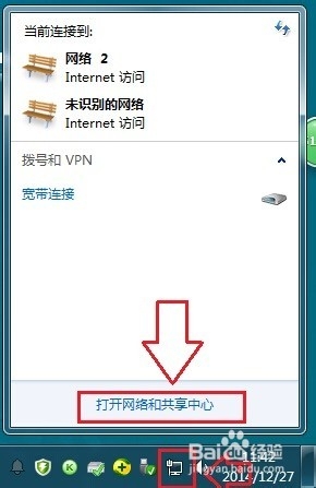 1、在电脑桌面的右下角有网络图标,点击该图标标---->点击“打开网络和共享中心”