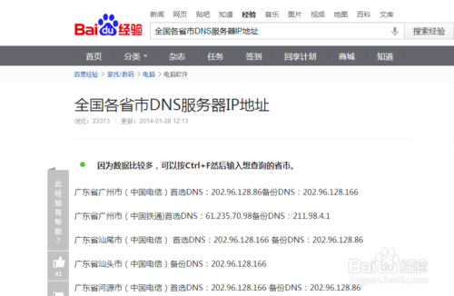 6、如果不知道DNS服务器IP地址,可以在百度中搜索:全国各省DNS服务器ip地址,选择离你近的地区填写。