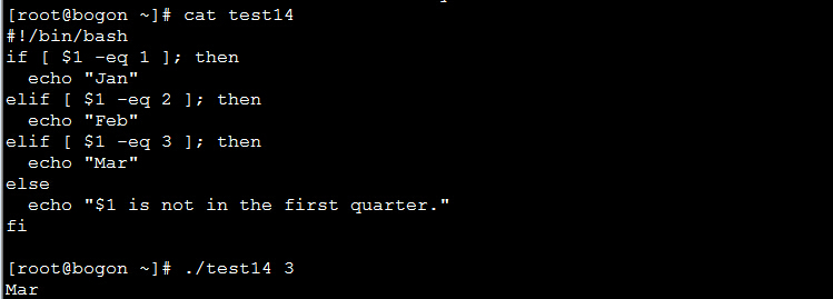 statement1 ... elif 判断条件2; then statement2 ... elif 判断条件3; then statement3 ... else statement4 ... fi