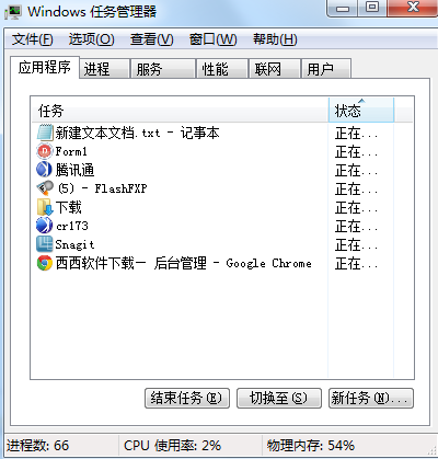 小编使用的是win7旗舰版,非正版,最近突然发现自己的任务管理器中只有一个应用程序的列表,其他进程、服务、性能、联网、用户几条都没有了,并且任务管理器打开后关不掉了,因为没有X按钮。