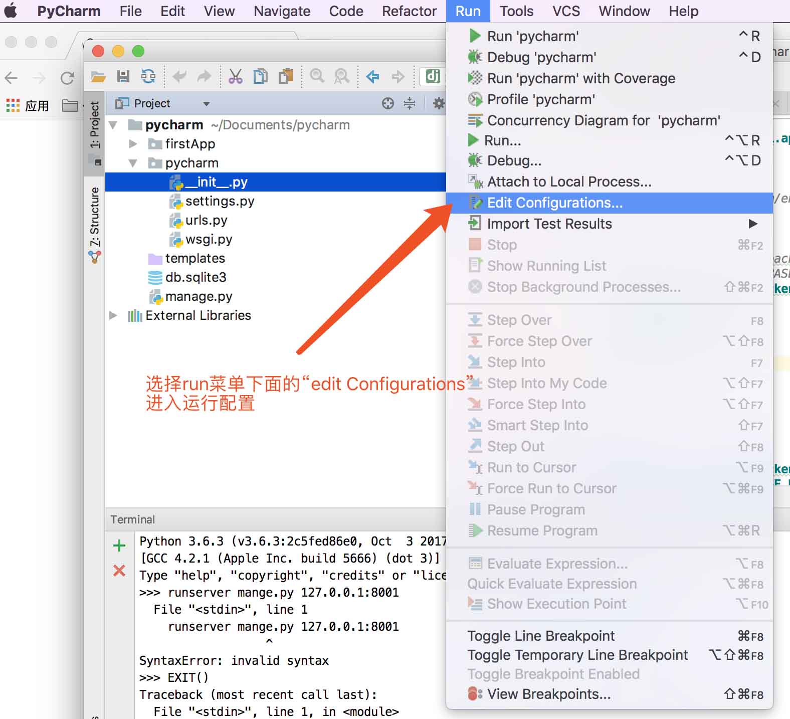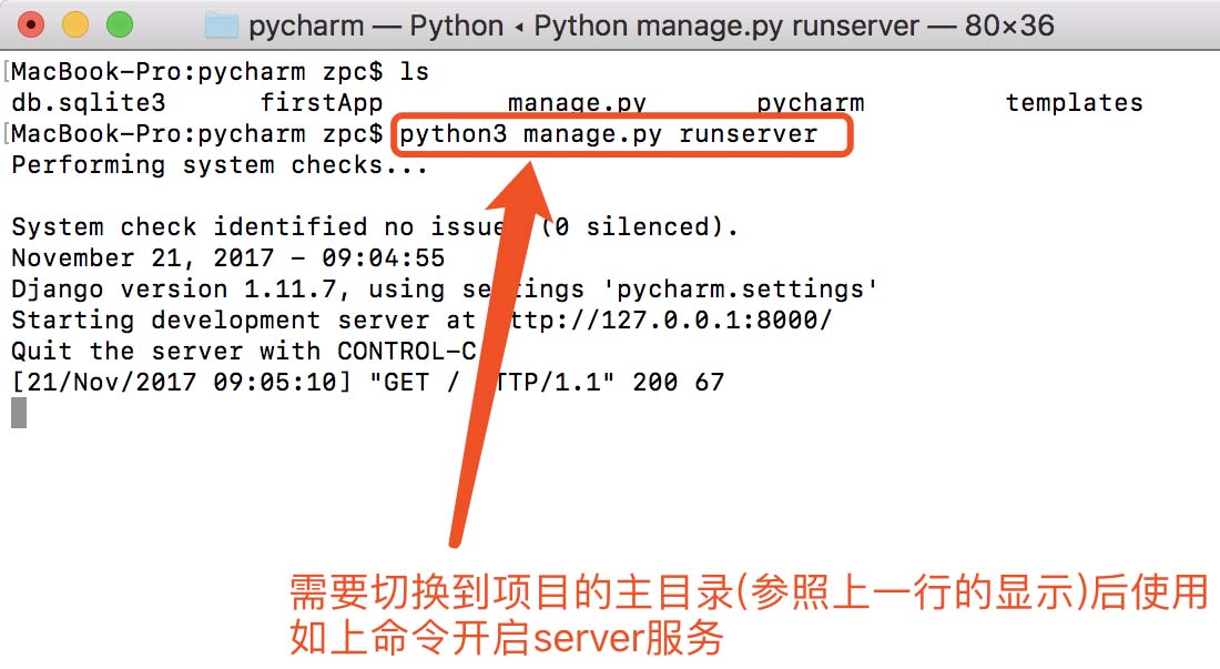 B>好~,进入Pycharm主界面后会项目大概是如下所示的结构,这里需要说明的是,默认运行的时候会应用sqlite3的数据库(见下图),嗯~,一开始怎么运行这个django项目呢,答案是:命令行(需要用到mac的默认终端,如下第二图),这里主要注意的是,如果如果装有Python3的的用户建议使用python3打头的命令才能使用python3开启服务(默认的是"python manage.py runserver",默认端口号为8000),浏览器访问地址亦见下图(http://127.0.0.1:8000),下图==》