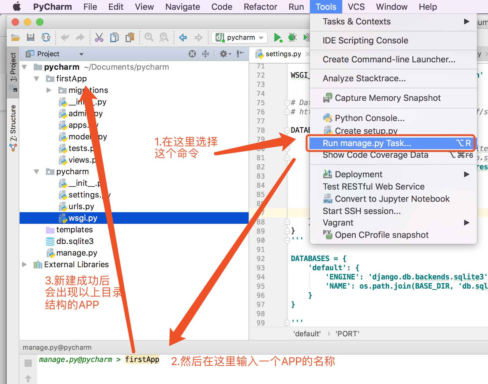 E>以上配置完毕也算是结束了,实际上并没有完成,当前创建的只是一个主项目,这个项目只包含了一个一些基本的配置,一般开发的时候都会根据需要新建一个单独的App,听起来是不是很不一样(如果是学java的同学就会有疑问了),这里我给出的解释是:这是Django项目的规范,方便同一个项目的模块隔离开发,既开发方便又维护方便,反正我就是这么认为哈~;好了,此功能也很简单只需要用到Tool菜单下的“run manage.py task..."命令,随后在命令窗口给一个App的名字然后回车即可(如有报错请根据输出的日志检查下报错原因),注意,此配置的最后需要将App的名称加入到主项目的setting.py中(INSTALLED_APPS变量)才可使用!