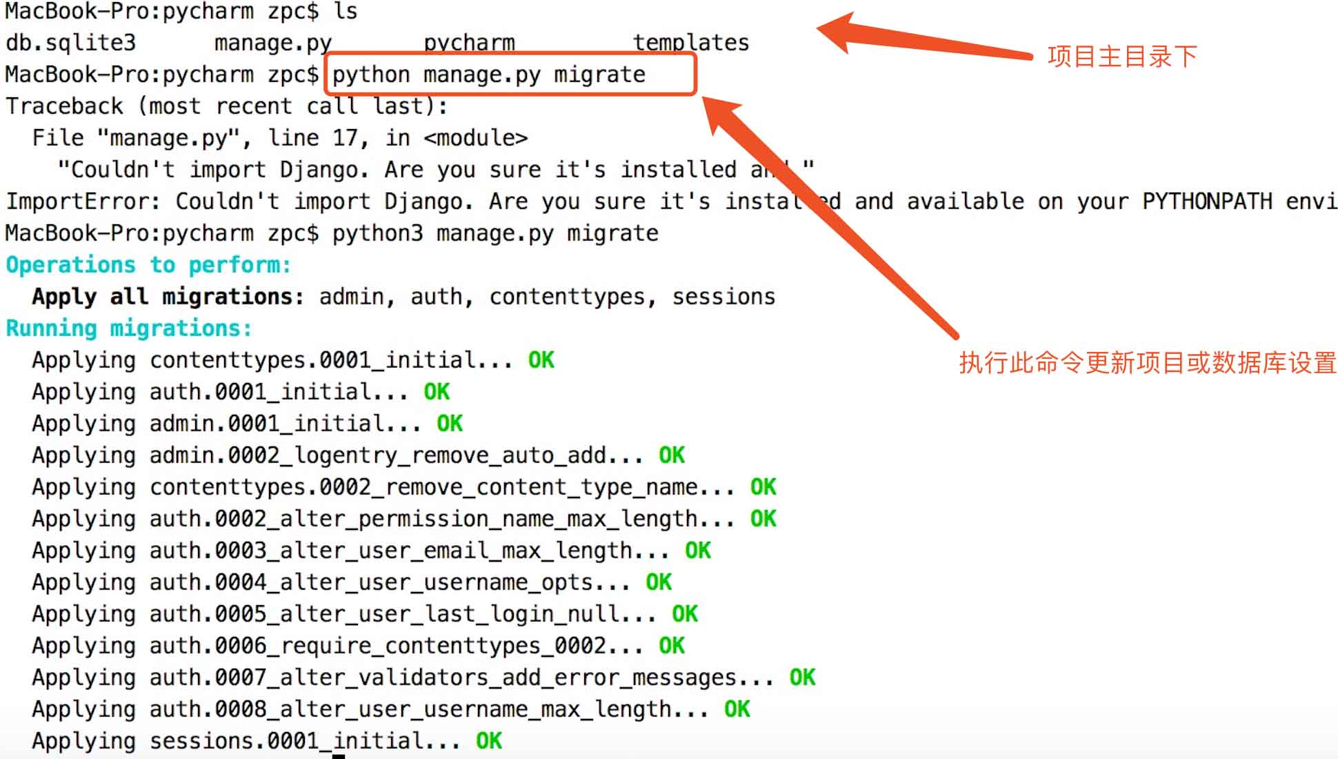 第一点》不管是切换数据库还是新建一个App,都要在终端中执行下这个命令:"python manage.py migrate",此命令以更新项目配置,如图-->