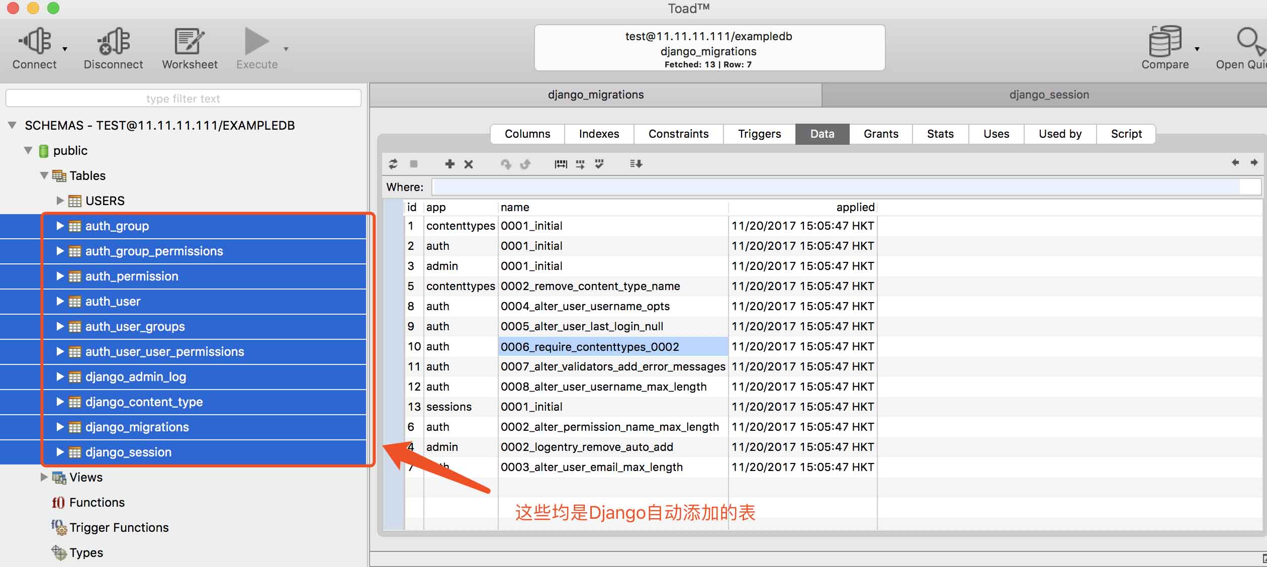 第二点》项目正常运行,如何知道项目是否已经成功切换至目标数据库?对于这个问题我想说的是:请直接用客户的查询下里面的表就知道了(我用的是Toad),具体看图-->