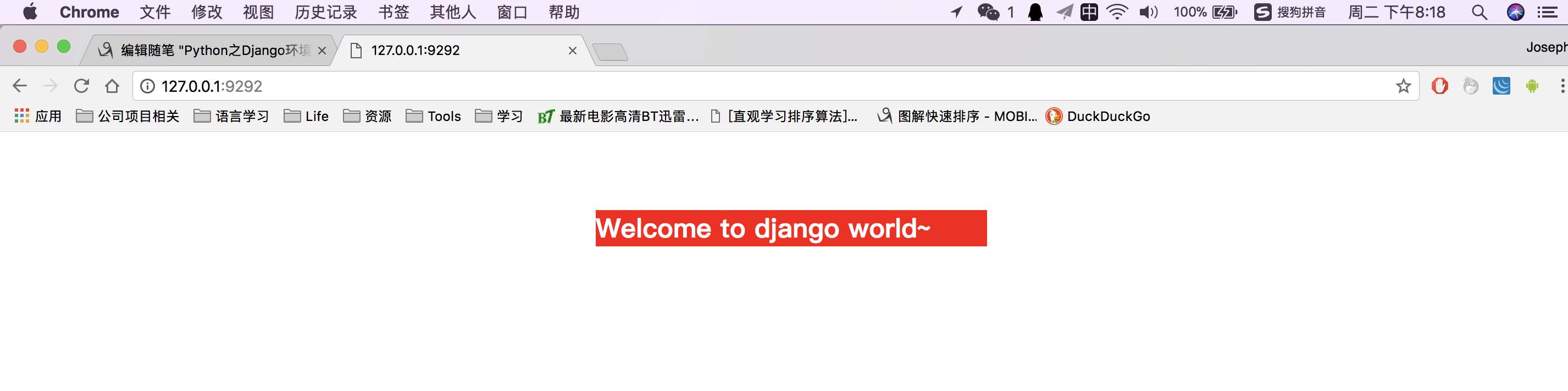 作为最后的结束语,展示下第一个Django页面,很low~