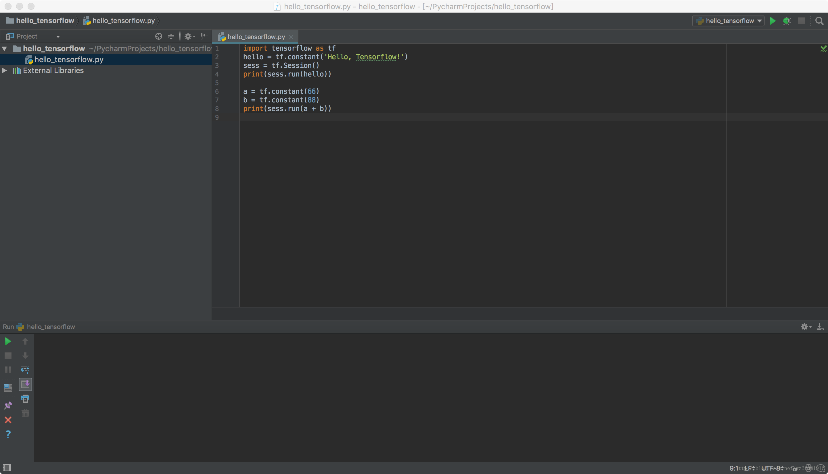 然后再执行以下Hello Tensorflow代码测试Tensorflow是否安装成