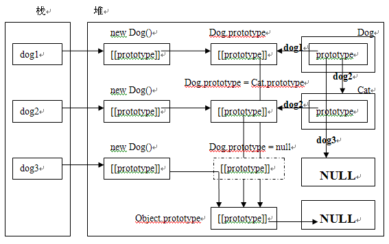程序本身是一个动态的概念,随着程序的执行,Dog.prototype会不断的改变。但是为了方便,我只画了一张图来表达这三次prototype引用的改变。在堆中,右边是函数对象的内存表示,中间的是函数对象的prototype属性的指向,左边的是函数对象创建的对象实例。其中函数对象指向prototype属性的指针上写了dog1,dog2,dog3分别对应Dog.prototype的三次引用改变。它们和栈中的dog1,dog2,dog3也有对应的关系。(注:关于函数对象将在后续博文中讲解)