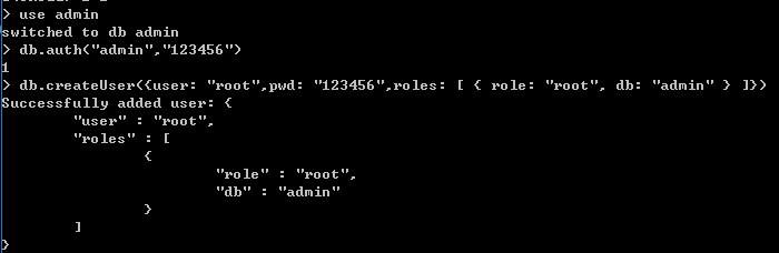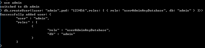 db.createUser({user: "admin",pwd: "123456",roles: [ { role: "userAdminAnyDatabase", db: "admin" } ]})