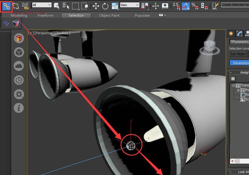 4、使用'选择并链接'工具,将光影与射灯连接(左键按住光源并拖拽到射灯上),这样一来当射灯移动时光源就会跟着移动啦。