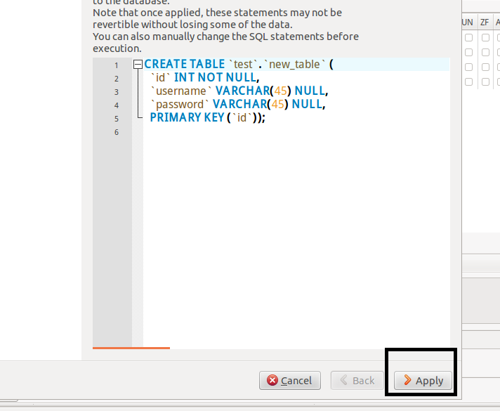 10、点击确定以后,会显示相应的SQL语句,直接选择Apply,则完成创建。