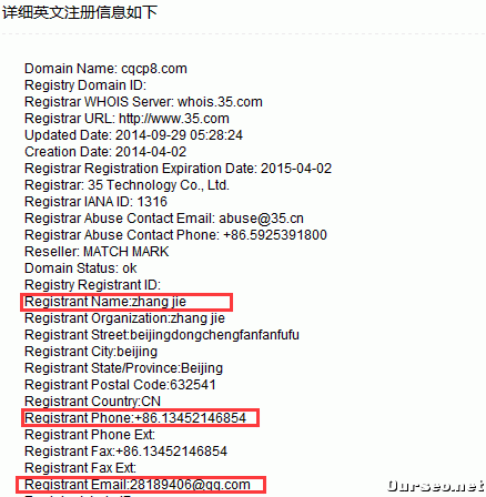 通过中国万网Whois域名查询:比如我客户跳转的彩票网站的域名信息如下: